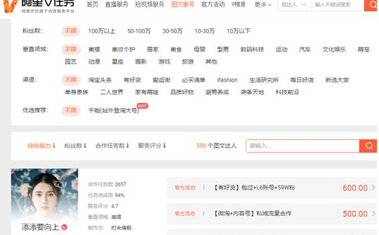 同样的我们假设这个时候转化率和客单价是不变的,我们想要提升销售额就要去提升店铺的访客,但是这个时候搜索流量已经被层级限制住了我们就要从别的流量入手了,在所有的流量里面效果最快转化也不错的有直通车、钻展、淘宝达人、直播、店铺微淘这五种方式,而其中直通车和钻展属于付费流量,在这两个流量渠道里面我们最常用的就是直通车,因为直通车容易操作而且费用也相对的比较少,所以这个时候我们就可以加大主推产品的直通车投入或者用直通车去推另外的产品,从而来拉高店铺的整体访客。淘宝达人和直播就属于合作的流量了,就好像当初的淘宝客一样,但是这两种流量是给店铺加权重的,具体的做法可以在淘宝客后台设置几个需要申请的专为达人准备的高佣金计划,来吸引一些相对小一点的达人来帮自己推介流量或者在淘宝达人广场发布任务,来吸引直播或者达人,这种好处就是合作基本是纯佣金形式的,没有销售是不会产生费用的,坏处就是效果比较慢。另外一种方式就是直接找达人合作,这种一般是佣金加服务费形式的,虽然贵了但是效果还是不错的。